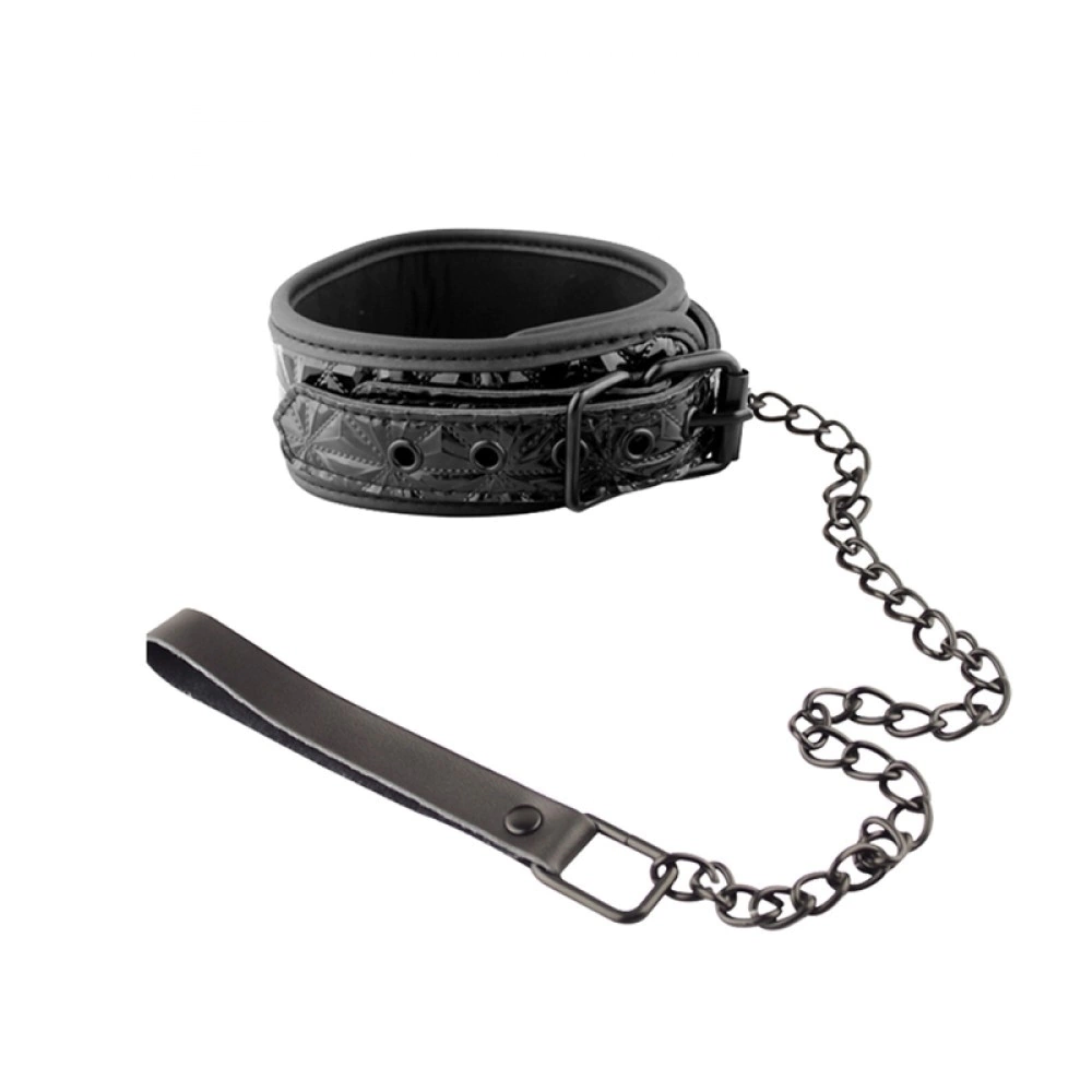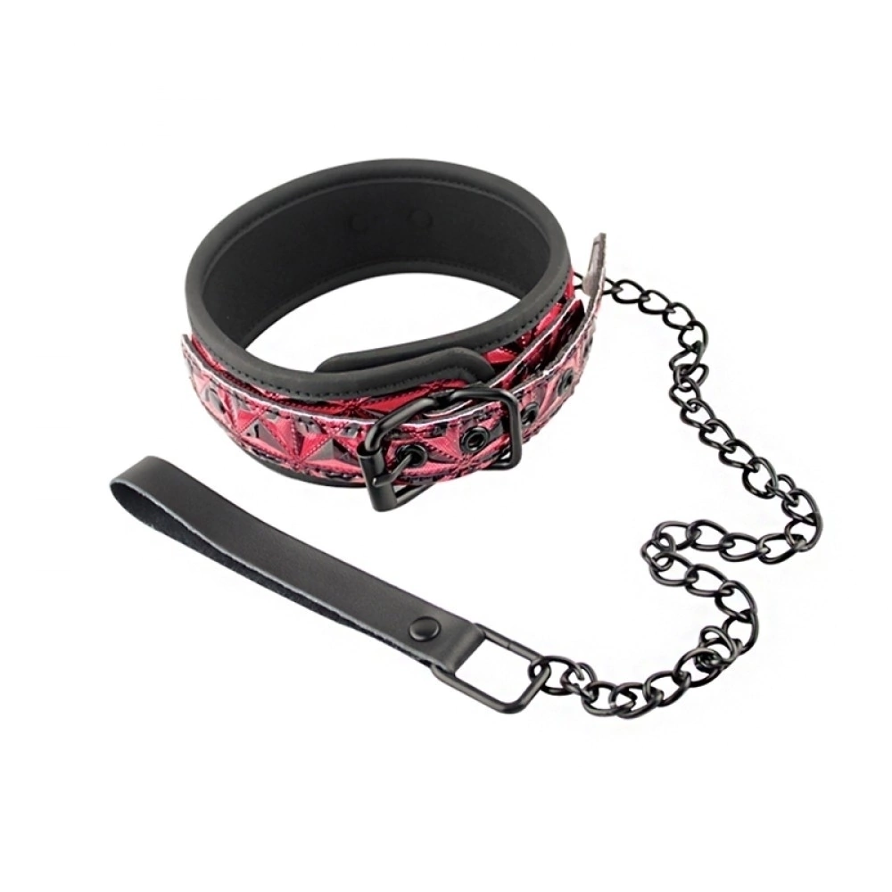 Coleira com um visual brilhante com desenhos em alto-relevo. A parte interna é composta por um material que proporciona um toque agradável à pele. Possui corrente de metal e uma alça de couro sintético. O fecho é composto por uma fivela que proporciona um eficaz e descomplicado ajuste.